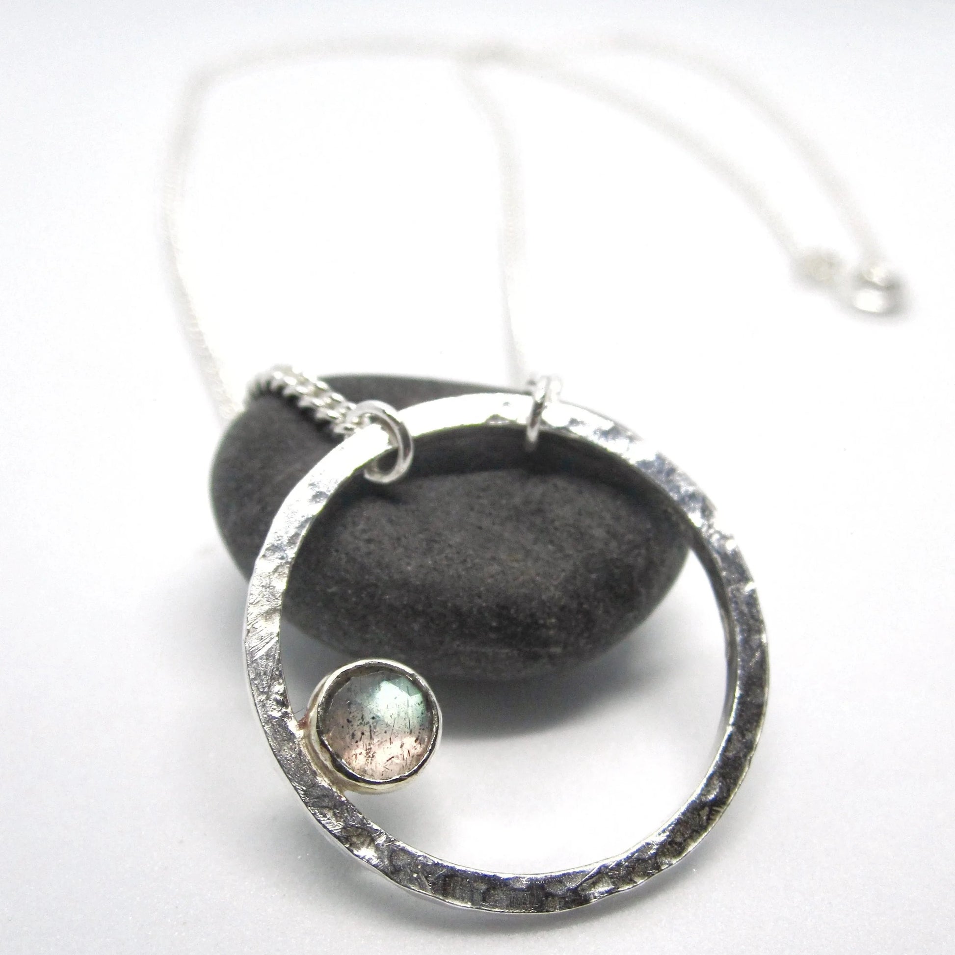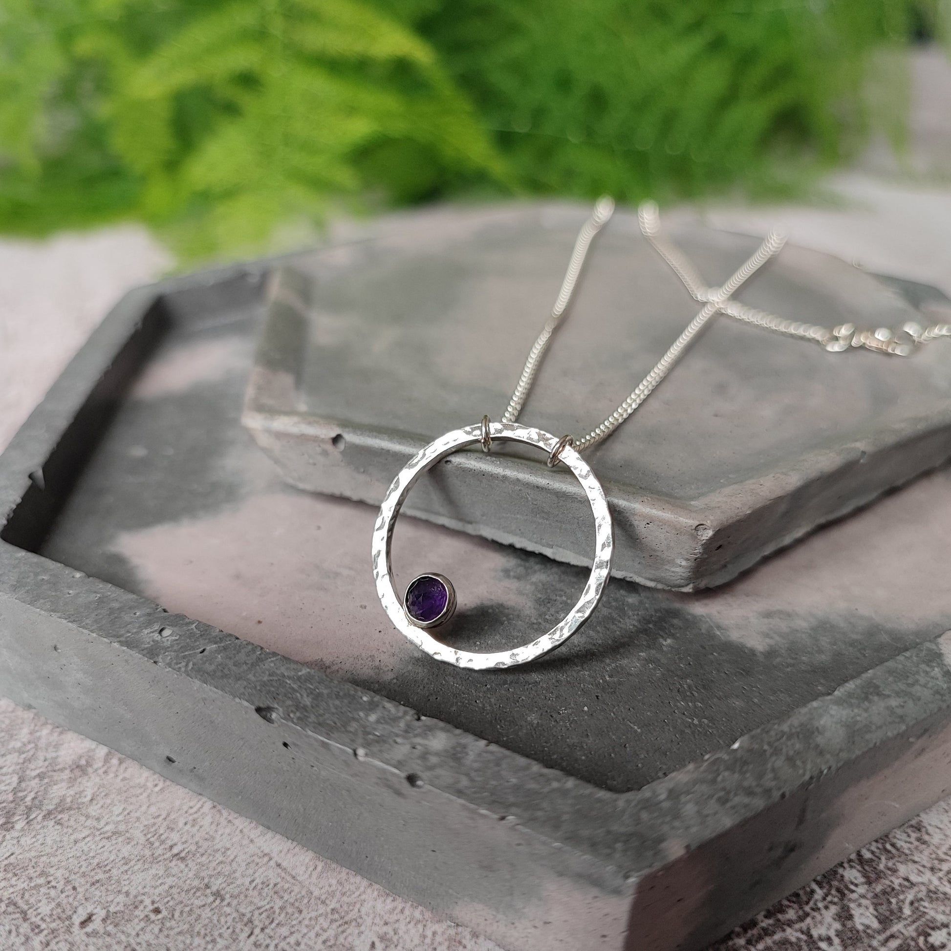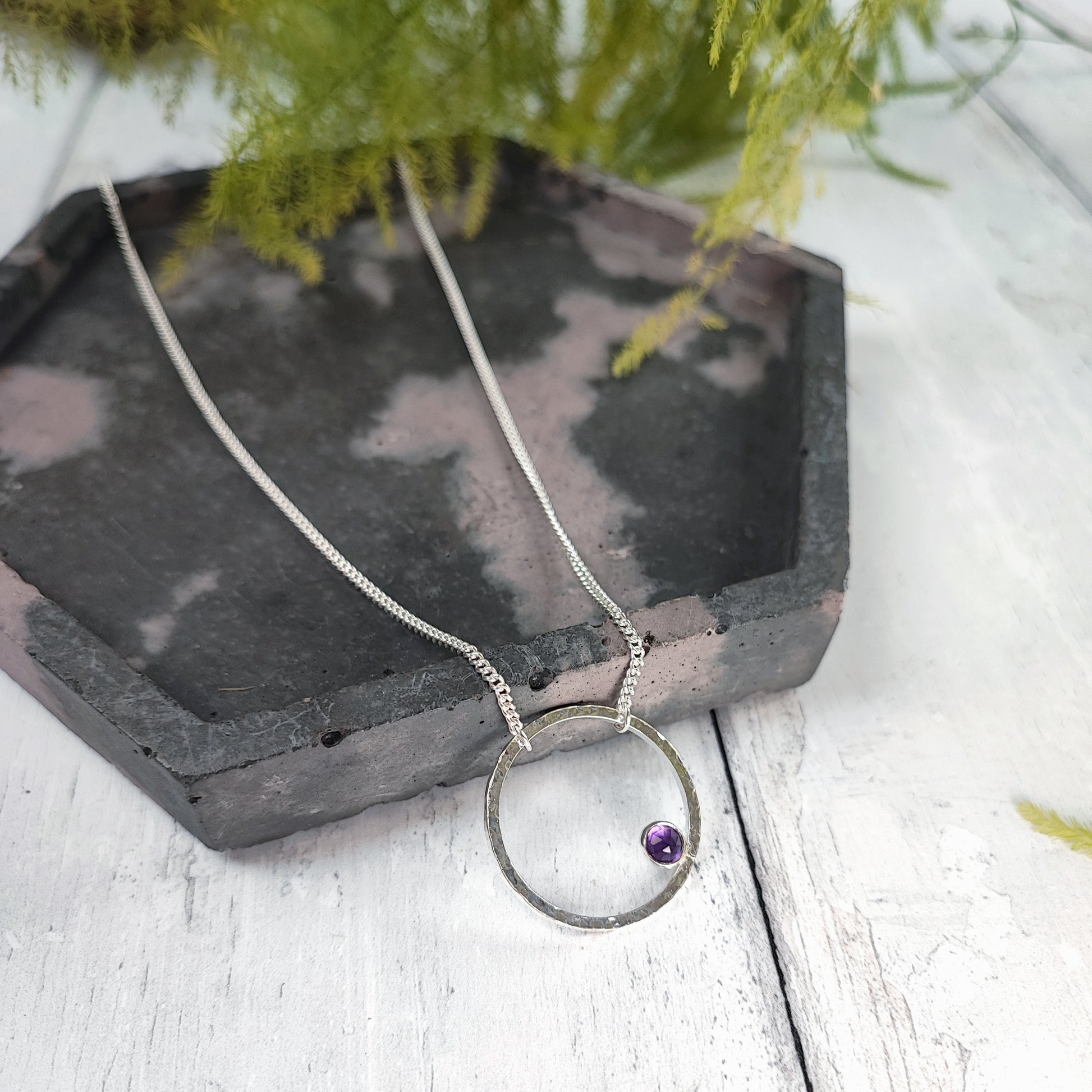 These sterling silver gem-set hammered hoop necklaces are beautifully simple and elegant with a splash of sparkle and colour. The stone is set in a simple silver bezel.
